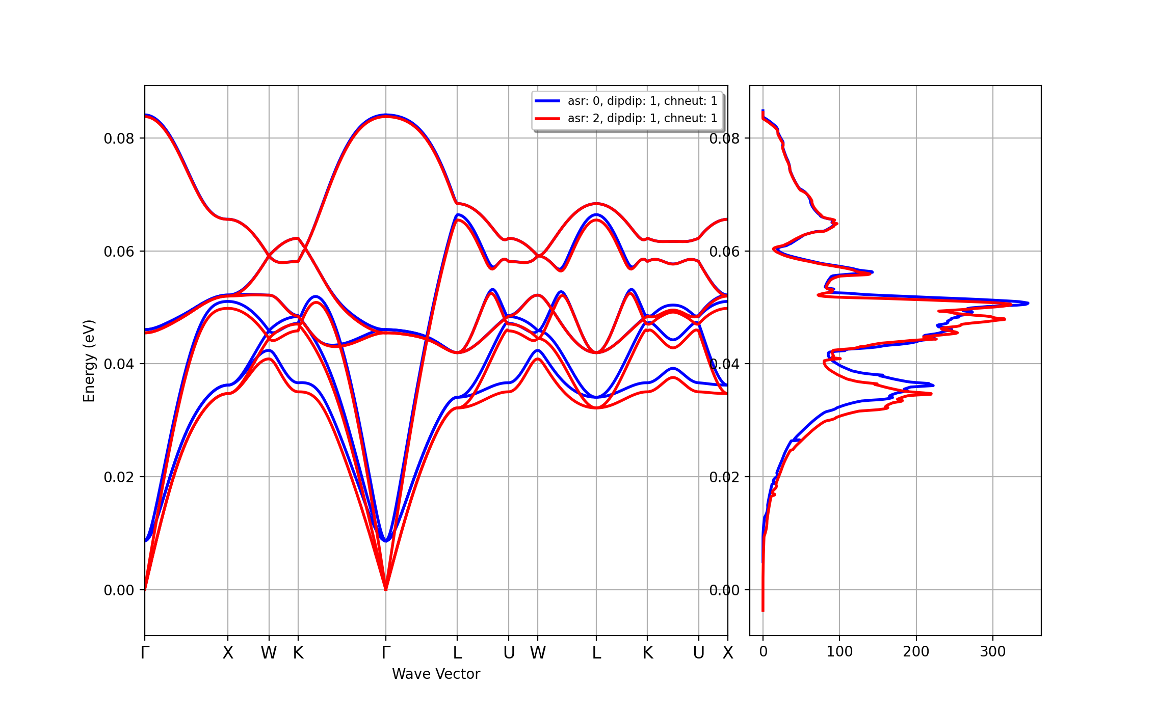 The AbiPy script used to executed the DFPT part is available here. Note that several parameters have been tuned to reach a reasonable compromise between accuracy and computational cost so do not expect the results obtained at the end of the lesson to be fully converged. More specifically, we use norm-conserving pseudopotentials with a cutoff energy ecut of 30 Ha (too low, it should be ~50 Ha). The DFPT computations is done for the set of irreducible \(\qq\)-points corresponding to a \(\Gamma\)-centered 4x4x4 \(\qq\) mesh (again, too coarse). \(\bm{Z}^*\) and \(\bm{\ee}^\infty\) are also computed with the same underconverged settings.
