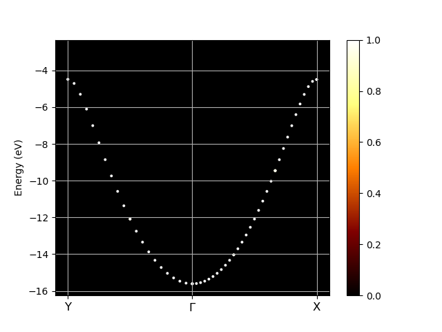 As you can see the unfolded band structure perfectly reproduces the anticipated dispersion relation \(E(k)=E_0 - 2A \cos(kb)\). We can even estimate the magnitude of the hopping matrix element between adjacent atoms \(V_{ssG} = -A\). The band width is \(4A = (-1) - (-12) = 11\) eV which results in \(V_{ssG} = -2.75\) eV.